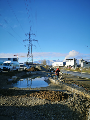 Situé sur un site pollué, une collaboration avec l’entreprise en ingénierie de l’environnement Karakas & français à été nécessaire afin d’analyser les sols et suivre l’évacuation des matériaux en décharge spécialisée. Afin de diminuer les coups d’évacuation, Le bassin a été imaginé en deux parties permettant ainsi d’épouser la topographie et limiter les volumes à excaver. Un travail important de tri des matériaux a été réalisé et a permis de conserver et réutiliser sur site les terres et graves non polluées.